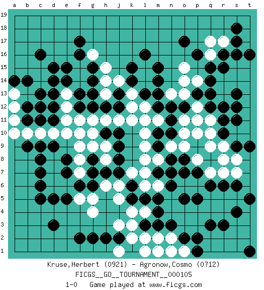Last move : 1-0 2023 May 3 4:45:29 [Event "FICGS__GO__TOURNAMENT__000105"] [Site "FICGS"] [Date "2022.08.19"] [Round "1"] [Black "Kruse,Herbert"] [White "Agronow,Cosmo"] [Result "1-0"] [Rating 1 "0921"] [Rating 2 "0712"] 1.c16 q4 2.d3 q16 3.f17 g4 4.c5 j3 5.r3 r4 6.q3 p3 7.p2 o3 8.o2 n2 9.n3 n4 10.m3 l4 11.m4 n5 12.m5 m6 13.n6 o4 14.l5 o6 15.n7 q10 16.o7 p6 17.o17 o15 18.p7 q7 19.q8 r8 20.q6 r7 21.p5 q5 22.o5 p4 23.s4 r5 24.r6 s5 25.s6 p8 26.f2 q9 27.g6 j6 28.g8 l6 29.k5 j5 30.j8 l8 31.k6 k7 32.j7 k4 33.l3 k3 34.g2 s7 35.d11 l2 36.t5 l7 37.l16 l15 38.k15 l14 39.k14 k13 40.l13 k12 41.m13 o13 42.m15 l12 43.m12 n9 44.m10 m11 45.n11 l11 46.n10 o9 47.m9 m8 48.n8 l9 49.o12 p12 50.g13 o11 51.n12 n13 52.q12 l10 53.q15 o10 54.m14 o14 55.p16 g10 56.e8 e10 57.g12 d10 58.c11 f10 59.s13 r13 60.q13 q11 61.r12 r14 62.o8 p10 63.j12 j11 64.j10 h11 65.h10 h9 66.j9 h8 67.h7 g9 68.e7 f8 69.g7 f7 70.f6 f9 71.p13 p11 72.c8 c10 73.r15 p14 74.r11 g11 75.d13 s14 76.q14 s15 77.r16 q17 78.s9 r9 79.s17 r17 80.s18 s10 81.s11 t11 82.j13 t13 83.s12 t12 84.r10 t10 85.t14 t15 86.t9 t14 87.s16 s8 88.t16 e6 89.e5 d6 90.c6 f5 91.d5 d7 92.c7 d8 93.d9 g5 94.h2 k2 95.d15 e12 96.c13 e11 97.f13 e13 98.e14 h14 99.f12 f14 100.g14 f15 101.g15 g16 102.f16 f11 103.h12 j14 104.c12 h15 105.e15 k11 106.d14 b10 107.b11 a11 108.b12 a12 109.b9 a10 110.b14 h6 111.n1 m2 112.k1 j1 113.j2 l1 114.m7 h13 115.d12 a13 116.a14 m1 117.t1 o1 118.p1 n1 119.c9 1-0 Follow this game move after move (download)On the second line six die, eight live. (Anonymous) The next best thing to gambling and winning is gambling and loosing. (Nick Dandalos)
