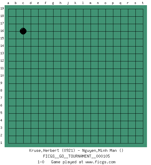 Last move : 1-0 2022 September 18 23:54:18 [Event "FICGS__GO__TOURNAMENT__000105"] [Site "FICGS"] [Date "2022.08.19"] [Round "1"] [Black "Kruse,Herbert"] [White "Nguyen,Minh Man"] [Result "1-0"] [Rating 1 "0921"] 1.c16 1-0 This go game has been lost on time (started : 2022.08.19 9:40:26) Follow this game move after move (download)Don't count territory held by only one eye. (Anonymous) When you stop learning you start dying. (Scott Adams)