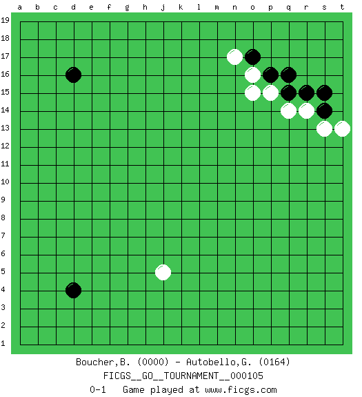 Last move : 0-1 2022 October 14 21:26:20 [Event "FICGS__GO__TOURNAMENT__000105"] [Site "FICGS"] [Date "2022.08.19"] [Round "1"] [Black "Boucher,Brice"] [White "Autobello,Giovanni"] [Result "0-1"] [Rating 1 "0000"] [Rating 2 "0164"] 1.d4 j5 2.q16 p15 3.p16 o15 4.d16 o16 5.q15 q14 6.r15 r14 7.s14 s13 8.s15 t13 9.o17 n17 0-1 This go game has been lost on time (started : 2022.08.19 9:40:26) Follow this game move after move (download)In the corner, five stones in a row on the third line are alive. (Anonymous) The beginning is the most important part of the work. (Plato)