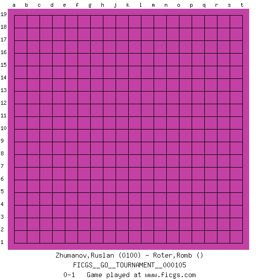 Last move : 0-1 2022 September 18 23:54:18 [Event "FICGS__GO__TOURNAMENT__000105"] [Site "FICGS"] [Date "2022.08.19"] [Round "1"] [Black "Zhumanov,Ruslan"] [White "Roter,Romb"] [Result "0-1"] [Rating 1 "0100"] 0-1 This go game has been lost on time (started : 2022.08.19 9:40:26) Follow this game move after move (download)In the opening, when you don't know what to play, make a shimari. (Jansteen) All men can see these tactics whereby I conquer, but what none can see is the strategy out of which victory is evolved. (Sun Tzu)