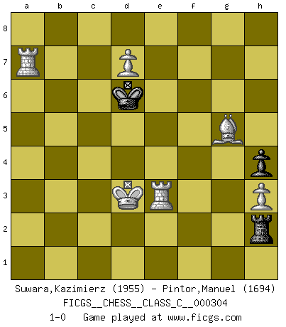 Last move : 1-0 2023 February 14 2:59:49 [Event "FICGS__CHESS__CLASS_C__000304"] [Site "FICGS"] [Date "2022.08.22"] [Round "1"] [White "Suwara,Kazimierz"] [Black "Pintor,Manuel"] [Result "1-0"] [WhiteElo "1955"] [BlackElo "1694"] 1.e4 e5 2.Nf3 Nc6 3.Bb5 Qf6 4.Ba4 Bc5 5.d3 Qg6 6.O-O Nge7 7.Nc3 O-O 8.a3 a6 9.Bxc6 Nxc6 10.b4 Ba7 11.Bb2 d6 12.Nd5 Bh3 13.Nh4 Qg5 14.Qf3 Qxh4 15.Qxh3 Qxh3 16.gxh3 Rac8 17.a4 Kh8 18.b5 axb5 19.axb5 Bd4 20.c3 Bb6 21.Nxb6 cxb6 22.bxc6 bxc6 23.f3 f5 24.Ra6 b5 25.Rf2 g5 26.Ba3 Rf6 27.c4 bxc4 28.dxc4 Kg7 29.Kg2 h5 30.Kg3 d5 31.exd5 cxd5 32.Ra7+ Kg6 33.cxd5 h4+ 34.Kg2 Rb6 35.d6 Kf6 36.d7 Rd8 37.Rd2 Ke6 38.Bc5 Rc6 39.Bb4 e4 40.fxe4 fxe4 41.Ba5 e3 42.Rd3 Rc2+ 43.Kf3 e2 44.Re3+ Kd6 45.Bxd8 Rc3 46.Kxe2 Rc2+ 47.Kd3 Rxh2 48.Bxg5 1-0 Follow this game move after move (download)In the perfect Chess combination as in a first-rate short story, the whole plot and counter-plot should lead up to a striking finale, the interest not being allayed until the very last moment. (Yates and Winter) Smyslow ist ein Beweis dafür, dass ich noch zehn Jahre spielen kann! [der 75 jährige über den 85 jährigen] (Viktor Kortschnoi) Con o sin el título, Bobby Fischer fue sin lugar a dudas el mas grande jugador de su época. (Burt Hochberg) Mon pion favori sur ma case favorite ! Bronstein en parlant d'un coup de pion en h5 quand il avait les Noirs. A journey of a thousand sites begins with a single click. (Author unknown)