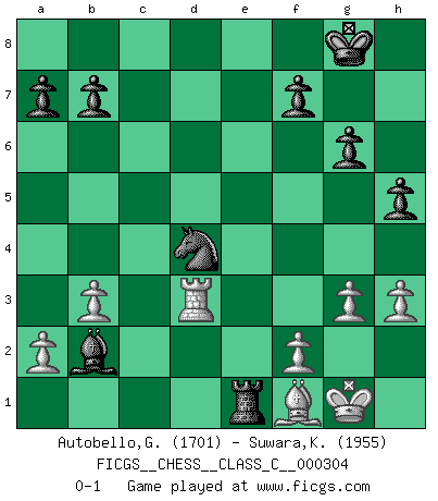 Last move : 0-1 2023 February 25 3:17:24 [Event "FICGS__CHESS__CLASS_C__000304"] [Site "FICGS"] [Date "2022.08.22"] [Round "1"] [White "Autobello,Giovanni"] [Black "Suwara,Kazimierz"] [Result "0-1"] [WhiteElo "1701"] [BlackElo "1955"] 1.c4 c5 2.Nf3 Nc6 3.g3 g6 4.Bg2 Bg7 5.O-O e6 6.Nc3 d6 7.e3 Nge7 8.d4 O-O 9.b3 Re8 10.Bb2 cxd4 11.exd4 d5 12.cxd5 exd5 13.Re1 Bg4 14.h3 Bxf3 15.Bxf3 Nxd4 16.Bg2 Ne6 17.Rb1 d4 18.Ne4 Nc6 19.Rc1 h5 20.Nc5 Nxc5 21.Rxc5 Rxe1+ 22.Qxe1 Qd7 23.Rd5 Re8 24.Qc1 Qe6 25.Rc5 Qe1+ 26.Qxe1 Rxe1+ 27.Bf1 d3 28.Rd5 Bxb2 29.Rxd3 Nd4 0-1 This chess game has been lost on time (started : 2022.08.22 10:11:56) Follow this game move after move (download)Adequate compensation for a sacrifice is having a sound combination leading to a winning position; adequate compensation for a blunder is having your opponent snatch defeat from the jaws of victory. (Bruce A. Moon) Schach ist gnadenlos. Du mußt bereit sein zu töten. (Nigel Short) El Ajedrez es en su esencia, un juego. En su forma, un arte. Y en su ejecución, una ciencia. (Baron Tassilo) Tout change constamment, y compris dans le monde des Echecs. (Botvinnik) Perhaps chess is the wrong game for the times (The Chess Master and the Computer, by Garry Kasparov - 2010)