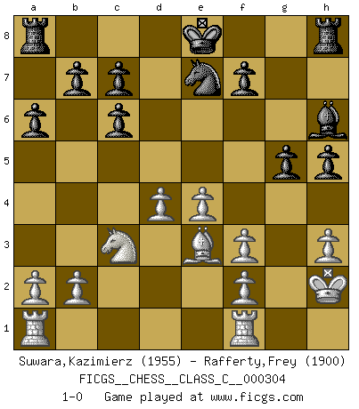 Last move : 1-0 2022 November 18 2:8:54 [Event "FICGS__CHESS__CLASS_C__000304"] [Site "FICGS"] [Date "2022.08.22"] [Round "1"] [White "Suwara,Kazimierz"] [Black "Rafferty,Frey"] [Result "1-0"] [WhiteElo "1955"] [BlackElo "1900"] 1.e4 e5 2.Nf3 Nc6 3.Bb5 a6 4.Bxc6 dxc6 5.O-O Bg4 6.h3 h5 7.c3 Qf6 8.d4 Bxf3 9.Qxf3 Qxf3 10.gxf3 exd4 11.cxd4 Ne7 12.Be3 g5 13.Kh2 Bh6 14.Nc3 1-0 Follow this game move after move (download)Chess problems demand from the composer the same virtues that characterize all worthwhile art: originality, invention, conciseness, harmony, complexity, and splendid insincerity. (Vladimir Nabokov) Jeder weiß, dass Gasprom Putins persönliches Machtinstrument ist. Die Firma wird vom Kreml aus geleitet und wird schon deshalb nie transparent sein. (Garry Kasparov) Si pudieramos observar el interior de la cabeza de un jugador de Ajedrez, encontraríamos ahí un mundo lleno de sentimientos, imágenes, ideas, emoción y pasión. (Alfred Binet) Votre seul travail dans les ouvertures est d'obtenir un milieu de partie jouable. (Lajos Portish) There is a computer disease that anybody who works with computers knows about. It's a very serious disease and it interferes completely with the work. The trouble with computers is that you 'play' with them ! (Richard P. Feynman)