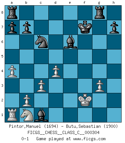 Last move : 0-1 2022 August 31 16:54:52 [Event "FICGS__CHESS__CLASS_C__000304"] [Site "FICGS"] [Date "2022.08.22"] [Round "1"] [White "Pintor,Manuel"] [Black "Butu,Sebastian"] [Result "0-1"] [WhiteElo "1694"] [BlackElo "1900"] 1.e4 e5 2.f4 exf4 3.Nf3 g5 4.Bc4 g4 5.O-O gxf3 6.Qxf3 Qf6 7.c3 d6 8.d4 Bh6 9.Qh5 Qg6 10.Qd5 Nf6 11.Qb5+ c6 12.Qb3 d5 13.exd5 Rg8 14.Rf2 Ne4 15.dxc6 Nxf2 16.Bxf7+ Qxf7 17.Qxf7+ Kxf7 18.Kxf2 Nxc6 19.g3 fxg3+ 20.hxg3 Bxc1 21.a4 Be6 0-1 Follow this game move after move (download)The most important feature of the Chess position is the activity of the pieces. This is absolutely fundamental in all phases of the game: Opening, Middlegame and especially Endgame. The primary constraint on a piece's activity is the Pawn structure. (Michael Stean) Stelle das Brett so, daß die Sonne in die Augen deines Gegners scheint. (Ruy López) Nunca antes ha habido un jugador de Ajedrez con tal conocimiento a fondo de las complejidades del juego y una inmensa voluntad absolutamente indomable de ganar. Yo pienso que Fischer es el jugador mas grande que jamás haya existido. (Lisa Lane) Les échecs c'est le défi de l'alpiniste, toujours plus haut, prêt à tout pour monter à l'assaut du Roi ennemi. Les échecs, c'est de la musique en mouvement, un ballet majestueux pour les yeux. C'est de la poésie composée par les fantômes du passé qui au même titre que Rimbaud ou Verlaine méritent notre admiration. Les échecs, c'est de la peinture ou le moindre mouvement modifie le tableau pour en faire un Picasso ou un Van Gogh. Les échecs, c'est tout et rien, c'est la vie et la mort. Jjulie33 sur le forum de France-Echecs. The problem with troubleshooting is that trouble shoots back. (Anonymous)