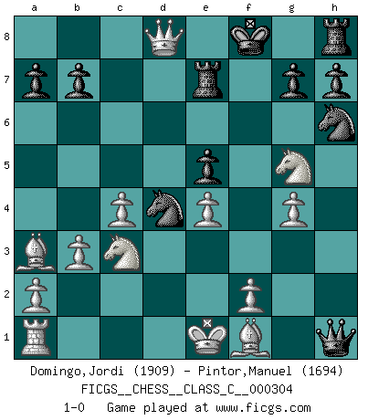 Last move : 1-0 2022 September 6 1:24:57 [Event "FICGS__CHESS__CLASS_C__000304"] [Site "FICGS"] [Date "2022.08.22"] [Round "1"] [White "Domingo,Jordi"] [Black "Pintor,Manuel"] [Result "1-0"] [WhiteElo "1909"] [BlackElo "1694"] 1.g4 e5 2.c4 Bc5 3.Nc3 d6 4.h3 Qh4 5.e3 f5 6.Nf3 Qh6 7.gxf5 Bxf5 8.e4 Bg4 9.d4 Qh5 10.hxg4 Qxh1 11.dxc5 Nc6 12.Ng5 Nd4 13.cxd6 cxd6 14.Qa4+ Kf8 15.Qd7 Nh6 16.Qxd6+ Kg8 17.Qd5+ Kf8 18.b3 Re8 19.Ba3+ Re7 20.Qd8+ 1-0 Follow this game move after move (download)I believe that Chess possesses a magic that is also a help in advanced age. A rheumatic knee is forgotten during a game of Chess and other events can seem quite unimportant in comparison with a catastrophe on the chessboard. (Vlastimil Hort) Ich bewundere Kasparows phantasievolle Angriffssiege aus den Achtzigern und Neunzigern, aber wenn man sie mit dem Computer überprüft, nimmt der Computer in jeder zweiten Partie die Opfer an, verteidigt sich und gewinnt. (Vladimir Kramnik) Un entendimiento minucioso de las típicas continuaciones de mate hacen de las mas complicadas combinaciones de sacrificio que conducen hacia ellas no solo no dificiles, sino casi un asunto de rutina. (Siegbert Tarrasch) Un journaliste : 'Vous préférez avoir une dame de plus sur l'échiquier ou au lit ?' Boris Spassky : 'Ca dépend de la position.' For peace of mind, resign as general manager of the universe. (Douglas Adams)