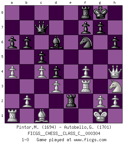 Last move : 1-0 2022 December 29 17:48:22 [Event "FICGS__CHESS__CLASS_C__000304"] [Site "FICGS"] [Date "2022.08.22"] [Round "1"] [White "Pintor,Manuel"] [Black "Autobello,Giovanni"] [Result "1-0"] [WhiteElo "1694"] [BlackElo "1701"] 1.e4 c5 2.f4 Nc6 3.Nf3 d6 4.Bc4 e6 5.O-O Nf6 6.d3 Be7 7.Ng5 h6 8.Nh3 O-O 9.c3 a6 10.a4 Qc7 11.Qf3 b6 12.Nd2 Bb7 13.Qg3 Kh8 14.Nf3 d5 15.exd5 exd5 16.Bb3 Na5 17.Bc2 Rad8 18.Ne5 d4 19.c4 Nc6 20.Bd1 Bd6 21.Qh4 Kg8 22.Nxc6 Bxc6 23.Qg3 Rde8 24.Bf3 Bxf3 25.Rxf3 Re2 26.Qh4 1-0 This chess game has been lost on time (started : 2022.08.22 10:11:56) Follow this game move after move (download)Chess, like love, like music, has the power to make people happy. (Siegbert Tarrasch) Schach ist ein Reich, wo sich die menschliche Phantasie frei entfalten kann. (David Bronstein) Fischer no está bajo la obligación de nadie. (Joseph Platz) Les échecs, c'est la lutte contre l'erreur. (Johannes Zukertort) I believe in luck. How else can you explain the success of those you dislike ? (Jean Cocteau)