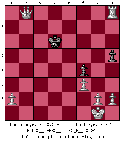 Last move : 1-0 2007 December 23 13:41:13 [Event "FICGS__CHESS__CLASS_F__000044"] [Site "FICGS"] [Date "2007.08.10"] [Round "1"] [White "Barradas,Anderson"] [Black "Dotti Contra,Alessandro"] [Result "1-0"] [WhiteElo "1307"] [BlackElo "1289"] 1.e4 Nc6 2.d4 d5 3.e5 e6 4.Nf3 f6 5.Bb5 Bd7 6.exf6 Nxf6 7.Bg5 Be7 8.Bxc6 bxc6 9.Ne5 O-O 10.O-O Rb8 11.b3 Ne4 12.Bxe7 Qxe7 13.c4 Be8 14.Nxc6 Bxc6 15.Re1 a5 16.cxd5 Bxd5 17.f3 Ng5 18.Nc3 Qb4 19.Nxd5 exd5 20.Re5 Nf7 21.Rxd5 c6 22.Rc5 Rfd8 23.Rc4 Qd6 24.Rac1 Rbc8 25.Qd2 c5 26.Rxc5 Qb6 27.Rxc8 Rxc8 28.Rxc8+ Nd8 29.Qf4 Qf6 30.Qxf6 gxf6 31.Rxd8+ Kf7 32.Ra8 a4 33.Rxa4 h6 34.Ra6 Kg7 35.d5 Kf7 36.d6 Ke8 37.Ra7 Kd8 38.b4 Kc8 39.b5 f5 40.b6 h5 41.Rh7 f4 42.Rh8+ Kd7 43.b7 Kxd6 44.b8Q+ 1-0 KP : Nimzovich defense Kingside Castling by player Black (move 9) Kingside Castling by player White (move 10) 10 pieces endgame at move 43 : White KRPPPPP , Black KPP WHITE : King + 1 Rook 5 Pawns BLACK : King + 2 Pawns Promotion Queen by player White (move 44) Player White won this chess game. Follow this game move after move (download)The beauty of a move lies not in its' appearance but in the thought behind it. (Siegbert Tarrasch) Es ist peinlich, dass ich nie Weltmeister wurde. Es wäre leicht, Leonid Breschnjew als Ursache vorzuschieben, dessen Apparat den Vorzeigekommunisten Anatoli Karpow in allem unterstützte. Aber Garri Kasparow zum Beispiel, der ebenfalls von den Sowjets unerwünscht war, hat trotz der Widerstände den WM-Titel erobert. (Viktor Kortschnoi) Fischer es el jugador mas fuerte del mundo. De hecho, el jugador mas fuerte que jamas haya existido. (Larry Evans) Le profane ne songe pas à la somme de jouissance dont il se prive, qui méconnaît ce jeu aux ressources aussi variées que passionnantes. (Jean-Marie Jeanton-Lamarche) All battles are fought by scared men who'd rather be someplace else. (John Wayne in the movie In harm's way)