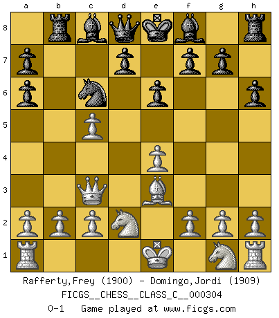 Last move : 0-1 2022 November 18 2:8:54 [Event "FICGS__CHESS__CLASS_C__000304"] [Site "FICGS"] [Date "2022.08.22"] [Round "1"] [White "Rafferty,Frey"] [Black "Domingo,Jordi"] [Result "0-1"] [WhiteElo "1900"] [BlackElo "1909"] 1.d4 h6 2.e4 c5 3.dxc5 e6 4.Be3 Na6 5.Bxa6 bxa6 6.Qd4 Rb8 7.Nd2 Ne7 8.Qc3 Nc6 0-1 Follow this game move after move (download)Good positions don't win games, good moves do. (Gerald Abrahams) Wie ich sie so einen nach dem anderen nieder mähte wurde meine Überlegenheit offensichtlich. (José Raúl Capablanca) Cuando tu no sabes absolutamente que mas hacer, es tiempo de entrar en pánico. (John van der Wiel) On a dit que l'homme se distingue de l'animal par le fait qu'il achète plus de livres qu'il ne peut en lire. Je voudrais suggérer qu'inclure à la liste des livres quelques livres d'échecs rendrait la distinction manifeste. (Edward Lasker) I would love to change the world, but they won't give me the source code. (Unknown)