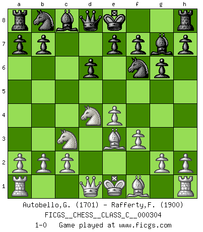 Last move : 1-0 2022 November 18 2:8:54 [Event "FICGS__CHESS__CLASS_C__000304"] [Site "FICGS"] [Date "2022.08.22"] [Round "1"] [White "Autobello,Giovanni"] [Black "Rafferty,Frey"] [Result "1-0"] [WhiteElo "1701"] [BlackElo "1900"] 1.e4 c5 2.Nf3 d6 3.d4 cxd4 4.Nxd4 Nf6 5.Nc3 g6 6.f3 Bg7 7.Be3 1-0 Follow this game move after move (download)Chess is ruthless: you've got to be prepared to kill people. (Nigel Short) Nicht daß Diemer aus Opportunismus Mitglied der NSDAP geworden wäre. Er war ein Fanatiker, in allem, was er tat. (Hans Ree) Los Peones son nacidos libres, y aún así, se encuentran por doquier encadenados. (Rick Kennedy) Aux échecs, l'amour-propre est satisfait quand on remporte la victoire, mais il n'y a pas de honte à être battu. (Benjamin Franklin) The age of a woman doesn't mean a thing. The best tunes are played on the oldest fiddles. (Ralph Waldo Emerson)
