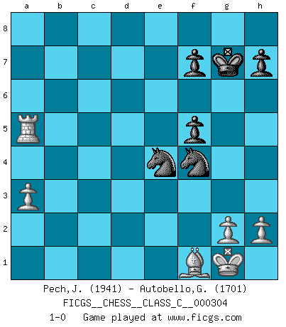 Last move : 1-0 2023 August 8 20:34:0 [Event "FICGS__CHESS__CLASS_C__000304"] [Site "FICGS"] [Date "2022.08.22"] [Round "1"] [White "Pech,Jaroslav"] [Black "Autobello,Giovanni"] [Result "1-0"] [WhiteElo "1941"] [BlackElo "1701"] 1.c4 Nf6 2.Nc3 b6 3.d4 Bb7 4.Nf3 e6 5.a3 Be7 6.d5 O-O 7.e4 exd5 8.cxd5 d6 9.Bd3 Nbd7 10.O-O Ne5 11.Bc2 c6 12.dxc6 Bxc6 13.Nd4 Rc8 14.f4 Ng6 15.Nxc6 Rxc6 16.Be3 a6 17.Bb3 b5 18.Kh1 Rxc3 19.bxc3 Nxe4 20.Rc1 Bf6 21.Qd5 Nxc3 22.Qd3 Na4 23.Rc6 Nb2 24.Qxd6 Qxd6 25.Rxd6 Ra8 26.Bd5 Nc4 27.Rxf6 gxf6 28.Bxa8 Nxe3 29.Rf3 Nc4 30.Bb7 a5 31.Ba6 Nd2 32.Rd3 Ne4 33.Rd8+ Kg7 34.Bxb5 Nxf4 35.Ra8 Nf2+ 36.Kg1 Ne4 37.Rxa5 f5 38.Bf1 1-0 This chess game has been lost on time (started : 2022.08.22 10:11:56) Follow this game move after move (download)All that matters on the Chessboard is good moves. (Bobby Fischer) Im Blitz ist es einfacher mit einer Figur weniger anzugreifen, als sich mit einer Mehrfigur zu verteidigen. (Mikhail Nekhemyevich Tal) Las Aperturas te enseñan aperturas. ¡Los Finales te enseñan Ajedrez!. (Stephan Gerzadowicz) Il n'y a pas eu de défaite parce que je ne crois pas que cet ordinateur ait jamais existé. IBM a triché en refusant d'imprimer les modes de recherche de la machine. C'est évident, pendant le match, des coups décisifs ont été joués par des êtres humains. Aujourd'hui, les meilleurs spécialistes en informatique ne peuvent toujours pas expliquer comment Deep-Blue a pu jouer contre la logique des ordinateurs. IBM a gagné une guerre de communication, mais ils sont incapables de prouver que l'ordinateur a gagné tout seul. (Garry Kasparov) The real voyage of discovery consists not in seeking new lands but in seeing with new eyes. (Marcel Proust)