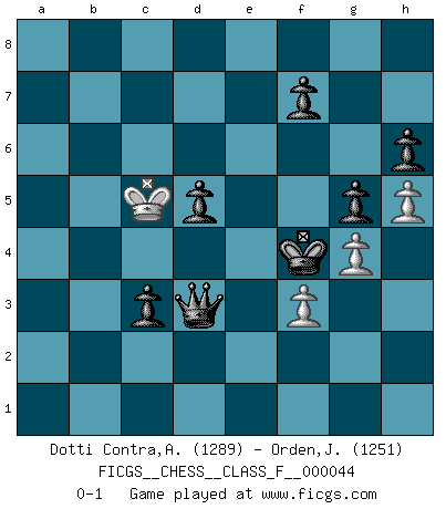 Last move : 0-1 2007 December 22 14:19:18 [Event "FICGS__CHESS__CLASS_F__000044"] [Site "FICGS"] [Date "2007.08.10"] [Round "1"] [White "Dotti Contra,Alessandro"] [Black "Orden,Jorge"] [Result "0-1"] [WhiteElo "1289"] [BlackElo "1251"] 1.e4 c5 2.Nf3 d6 3.Bc4 Nf6 4.d3 e6 5.O-O Be7 6.Bg5 O-O 7.Qd2 Nc6 8.Nc3 a6 9.Rfe1 b5 10.Bb3 h6 11.Bh4 Ng4 12.Bxe7 Qxe7 13.a4 bxa4 14.Bxa4 Bb7 15.Bxc6 Bxc6 16.d4 Qb7 17.d5 Bb5 18.b3 Qb6 19.h3 Nf6 20.Na4 Bxa4 21.Rxa4 Qb7 22.b4 exd5 23.exd5 Qxd5 24.b5 Qxd2 25.Nxd2 axb5 26.Rxa8 Rxa8 27.Ne4 Nxe4 28.Rxe4 Kf8 29.c4 b4 30.Re3 Re8 31.Rd3 Ke7 32.Re3+ Kd7 33.Rg3 g6 34.h4 Re4 35.h5 g5 36.Rf3 Ke6 37.Rb3 Rxc4 38.f3 Rc3 39.Rb1 b3 40.Rb2 c4 41.Re2+ Kf5 42.Kf2 Rc2 43.g4+ Kf4 44.Kf1 Rxe2 45.Kxe2 b2 46.Kd2 b1Q 47.Kc3 d5 48.Kd4 Qd3+ 49.Kc5 c3 0-1 Sicilian Kingside Castling by player White (move 5) Kingside Castling by player Black (move 6) Promotion Queen by player Black (move 46) Player Black won this chess game. Follow this game move after move (download)I played Chess with him and would have beaten him sometimes only he always took back his last move, and ran the game out differently. (Mark Twain) Schach verlangt totale Konzentration. (Robert James Fischer) Tu sabes que vas a perder. Aún cuando tenía la ventaja, yo sabía que iba a perder. - al estar jugando con Fischer (Andrew Soltis) Celui qui prend des risques peut perdre, celui qui n'en prend pas perd toujours. (Xavier Tartacover) Sometimes it pays to stay in bed in Monday, rather than spending the rest of the week debugging Monday's code. (Dan Salomon)