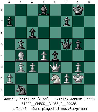 Last move : 1/2-1/2 2022 December 12 8:47:43 [Event "FICGS__CHESS__CLASS_A__000261"] [Site "FICGS"] [Date "2022.08.23"] [Round "1"] [White "Javier,Christian"] [Black "Swiatek,Janusz"] [Result "1/2-1/2"] [WhiteElo "2154"] [BlackElo "2224"] 1.e4 e5 2.Nf3 Nc6 3.Bb5 Nf6 4.O-O Nxe4 5.Re1 Nd6 6.Nxe5 Be7 7.Bf1 Nxe5 8.Rxe5 O-O 9.d4 Bf6 10.Re1 Re8 11.c3 Rxe1 12.Qxe1 Ne8 13.Bf4 d5 14.Nd2 Bf5 15.Qe2 c6 16.Re1 Nd6 17.Qf3 Bg6 18.g3 Qd7 19.Nb3 b6 20.h4 h6 21.Nc1 Re8 22.Qd1 Rxe1 23.Qxe1 Nc4 24.b3 Na3 25.Qe3 Nc2 26.Qe2 Na3 27.Qe3 Nb1 28.Bd3 Be4 29.Ne2 Qf5 30.Bxe4 dxe4 31.Kg2 g5 32.Bd6 b5 33.hxg5 hxg5 34.Bb4 Bd8 1/2-1/2 Follow this game move after move (download)Every Pawn is a potential Queen. (James Mason) Nur ein wirklich starker Spieler weiß wie schwach er spielt. (Savielly Grigorievitsch Tartakower) Todos los jugadores de Ajedrez deberían tener un pasatiempo. (Savielly Tartakower) Les Echecs sont et restent toujours un combat, un combat intégral comme la boxe, la lutte ou un autre sport, et où il doit y avoir un vainqueur et un vaincu. (Joseph Emil Diemer) A good teacher is like a candle - it consumes itself to light the way for others. (Author unknown)