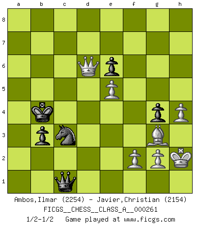 Last move : 1/2-1/2 2022 November 8 11:55:55 [Event "FICGS__CHESS__CLASS_A__000261"] [Site "FICGS"] [Date "2022.08.23"] [Round "1"] [White "Ambos,Ilmar"] [Black "Javier,Christian"] [Result "1/2-1/2"] [WhiteElo "2254"] [BlackElo "2154"] 1.d4 d5 2.c4 c6 3.Nf3 Nf6 4.Nc3 e6 5.Bg5 h6 6.Bh4 dxc4 7.e4 g5 8.Bg3 b5 9.h4 g4 10.Ne5 Nbd7 11.Be2 Rg8 12.Nxc6 Qb6 13.Ne5 Bb4 14.Nxd7 Bxc3+ 15.bxc3 Bxd7 16.e5 Nd5 17.Qd2 a5 18.O-O b4 19.Bxc4 Nxc3 20.Rfc1 Rc8 21.Bf1 Bb5 22.Bxb5+ Qxb5 23.Kh2 Qc4 24.Qxh6 Qxd4 25.Rab1 Kd7 26.Rb2 Kc6 27.a3 Kb5 28.axb4 axb4 29.Rd2 Rh8 30.Qg5 Rcg8 31.Qxg8 Qxd2 32.Qxh8 Qxc1 33.Qe8+ Ka5 34.Qxf7 b3 35.Qc7+ Kb4 36.Qd6+ 1/2-1/2 Follow this game move after move (download)A man without frontiers. He didn't divide the East and the West, he brought them together in their admiration for him. (Ljubomir Ljubojevic, about Bobby Fischer's death) Ich organisiere ein großes Turnier, was mich etwa 120000 Dollar kostet. Ich denke, das ist das erste Mal in der Schachgeschichte, daß ein Schachgroßmeister auch als Mäzen auftritt. (Miguel Najdorf) ¡Examina movidas que hagan daño! Un buen ojo for movidas desvastantes es mucho mas importante que el conocimiento de principios estratégicos. (Purdy) La tactique, c'est ce que vous faites quand il y a quelque chose à faire; la stratégie, c'est ce que vous faites quand il n'y a rien à faire. (Savielli Tartacower) A shortcut is the longest distance between two points. (Don Groves)