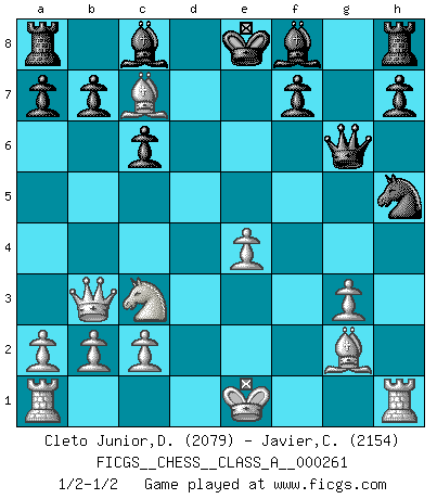 Last move : 1/2-1/2 2022 September 16 5:8:39 [Event "FICGS__CHESS__CLASS_A__000261"] [Site "FICGS"] [Date "2022.08.23"] [Round "1"] [White "Cleto Junior,Dirceu"] [Black "Javier,Christian"] [Result "1/2-1/2"] [WhiteElo "2079"] [BlackElo "2154"] 1.e4 e5 2.f4 Nc6 3.Nf3 exf4 4.d4 g5 5.d5 g4 6.dxc6 gxf3 7.Qxf3 Qh4+ 8.g3 fxg3 9.hxg3 Qf6 10.Qb3 Qg6 11.Bg2 dxc6 12.Bf4 Nf6 13.Nc3 Nh5 14.Bxc7 1/2-1/2 Follow this game move after move (download)It is difficult to play against Einstein's theory --on his first loss to Fischer. (Mikhail Tal) Ich verstehe den Grund nicht, warum die Aufteilung in Frauen und Männer überhaupt im Schach besteht. (Judith Polgar) Cuando no sepas que mover, espera por una idea que se le venga a la la cabeza de tu oponente. Tenlo por seguro de que esa idea estará incorrecta. (Siegbert Tarrasch) Le génie consiste à savoir transgresser les règles au moment opportun. (Teichmann) The large trees attract high winds. (Chinese proverb)