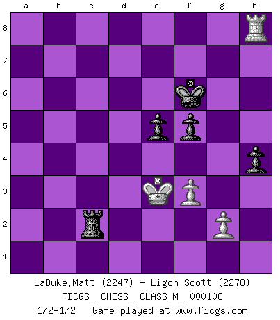 Last move : 1/2-1/2 2022 September 27 4:0:58 [Event "FICGS__CHESS__CLASS_M__000108"] [Site "FICGS"] [Date "2022.08.23"] [Round "1"] [White "LaDuke,Matt"] [Black "Ligon,Scott"] [Result "1/2-1/2"] [WhiteElo "2247"] [BlackElo "2278"] 1.e4 d5 2.exd5 Nf6 3.Nf3 Nxd5 4.d4 e6 5.c4 Nf6 6.Nc3 c5 7.Be3 Ng4 8.Bg5 f6 9.Bh4 cxd4 10.Nxd4 Nc6 11.Nxc6 Qxd1+ 12.Rxd1 bxc6 13.Be2 Nh6 14.Bh5+ Nf7 15.O-O Rb8 16.Na4 g5 17.Bg3 e5 18.h4 h6 19.f3 Bf5 20.b3 Rg8 21.Bf2 gxh4 22.Bxh4 Bg6 23.Bxg6 Rxg6 24.Bf2 a5 25.Bc5 f5 26.Bxf8 Kxf8 27.Nc5 Re8 28.Rfe1 h5 29.Kf2 h4 30.Rd2 Rh6 31.Rd7 Kg8 32.a4 Rg6 33.Nd3 Rf6 34.b4 axb4 35.a5 Ra8 36.Nxb4 Rxa5 37.Rc7 Kg7 38.Re2 Kh6 39.Rc2 Nd8 40.Rc8 c5 41.Rxd8 cxb4 42.Rb8 Ra4 43.Rb5 Kg5 44.Rb2 b3 45.R5xb3 Rxc4 46.Rb8 Rfc6 47.Re2 Rc2 48.Rh8 Rxe2+ 49.Kxe2 Rc2+ 50.Ke3 Kf6 1/2-1/2 Follow this game move after move (download)Whoever sees no other aim in the game than that of giving checkmate to one's opponent will never become a good Chess player. (Euwe) Ich glaube nicht an Psychologie, ich glaube an gute Züge. (Robert James Fischer) Los asuntos humanos son como una partida de Ajedrez: solo aquellos que no lo toman seriamente, pueden ser llamados buenos jugadores. (Hung Tzu Ch'eng) Des idées, des idées, j'en ai cent, j'en ai mille. Des bonnes, des mauvaises, applicables, irréalisables... Il suffit de faire le tri ! (Roos) If you lose the game you should win the analysis! (Proverb)
