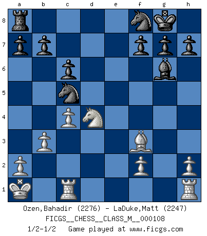 Last move : 1/2-1/2 2022 October 8 22:48:15 [Event "FICGS__CHESS__CLASS_M__000108"] [Site "FICGS"] [Date "2022.08.23"] [Round "1"] [White "Ozen,Bahadir"] [Black "LaDuke,Matt"] [Result "1/2-1/2"] [WhiteElo "2276"] [BlackElo "2247"] 1.d4 d5 2.c4 e6 3.Nc3 c6 4.e4 dxe4 5.Nxe4 Bb4+ 6.Bd2 Qxd4 7.Bxb4 Qxe4+ 8.Be2 Na6 9.Bd6 Qxg2 10.Qd2 Nf6 11.Bf3 Qg6 12.O-O-O e5 13.Bxe5 Be6 14.Ne2 Qf5 15.Bf4 Qc5 16.b3 Qa3+ 17.Kb1 Bf5+ 18.Ka1 O-O 19.Bd6 Nc5 20.Qe3 Nfd7 21.Bxf8 Nxf8 22.Nd4 Bg6 23.Qc1 Qxc1+ 24.Rxc1 1/2-1/2 Follow this game move after move (download)Bobby Fischer is the greatest Chess genius of all time ! (Alexander Kotov) Alle Schachspieler sollten auch ein Hobby haben. (Savielly Grigorievitsch Tartakower) El hombre es un frívolo, una creatura engañosa y como un jugador de Ajedrez, se preocupa mas por el proceso de obtener su meta que de la meta por sí misma. (Dostoyevsky) Ce qui caractérise les parties de combat, c'est que si le défenseur a constamment de difficiles problèmes à résoudre, l'attaquant doit chercher sans relâche de nouvelles possibilités d'attaque. (Koblentz) Man with more than one clock never knows what time it is. (Chinese thought)