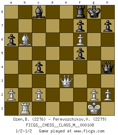 Last move : 1/2-1/2 2022 October 1 12:35:6 [Event "FICGS__CHESS__CLASS_M__000108"] [Site "FICGS"] [Date "2022.08.23"] [Round "1"] [White "Ozen,Bahadir"] [Black "Perevozchikov,Vjacheslav"] [Result "1/2-1/2"] [WhiteElo "2276"] [BlackElo "2279"] 1.e4 e6 2.d4 d5 3.Nc3 Nf6 4.e5 Nfd7 5.f4 c5 6.Nf3 Nc6 7.Be3 cxd4 8.Nxd4 Qb6 9.Qd2 Qxb2 10.Rb1 Qa3 11.Bb5 Nxd4 12.Bxd4 a6 13.Bxd7+ Bxd7 14.Rb3 Qe7 15.Rxb7 Rc8 16.O-O Qd8 17.Qe3 Rc4 18.Rfb1 Be7 19.f5 Bg5 20.Qd3 O-O 21.Ne4 Bc8 22.Bb6 Be3+ 23.Qxe3 Qh4 24.Nf6+ gxf6 25.Rc7 exf5 26.Rxc4 dxc4 27.exf6 1/2-1/2 Follow this game move after move (download)Chess is a sea in which a gnat may drink and an elephant may bathe. (Hindu proverb) Über Frauen: Chess is better. (Robert James Fischer) Personalmente, yo prefiero mirar hacia el futuro en donde un programa de computadora gane el título mundial de Ajedrez. La humanidad necesita una lección de humildad. (Richard Dawkings) Il n'y a plus de joueurs du niveau de Jacob Murray dont la seule quête est le beau jeu, le plaisir de voir les pièces construire quelque chose. Sur 10 idées à la minute, 9 seront sans intérêt, la dernière s'avèrera géniale. (Christian Bauer) It is not titles that honor men, but men that honor titles. (Niccolo Machiavelli)
