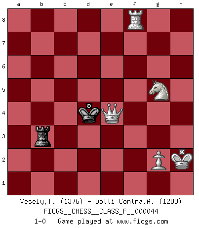 Last move : 1-0 2008 January 12 19:8:34 [Event "FICGS__CHESS__CLASS_F__000044"] [Site "FICGS"] [Date "2007.08.10"] [Round "1"] [White "Vesely,Tomas"] [Black "Dotti Contra,Alessandro"] [Result "1-0"] [WhiteElo "1376"] [BlackElo "1289"] 1.e4 Nc6 2.b3 e5 3.Ba3 Bxa3 4.Nxa3 Nf6 5.Qf3 d6 6.h3 O-O 7.Bb5 a6 8.Bc4 Be6 9.c3 d5 10.Bxd5 Bxd5 11.exd5 e4 12.Qg3 Qd6 13.dxc6 bxc6 14.Nc4 Qxg3 15.fxg3 Nd5 16.Ne2 a5 17.Nd4 Ne7 18.O-O a4 19.g4 axb3 20.axb3 Rxa1 21.Rxa1 h6 22.Ra7 Nd5 23.Ne5 c5 24.Nd7 Re8 25.Nf5 e3 26.dxe3 Kh7 27.Nxc5 g6 28.Nd4 Rxe3 29.c4 Rc3 30.cxd5 Rxc5 31.d6 cxd6 32.Rxf7+ Kg8 33.Rd7 Rd5 34.Ne6 Rd1+ 35.Kh2 d5 36.Rg7+ Kh8 37.Rxg6 Kh7 38.Rg7+ Kh8 39.Rd7 Rd3 40.g5 hxg5 41.Nxg5 d4 42.h4 Rd2 43.h5 Rb2 44.Ne6 Rxb3 45.h6 d3 46.Ng5 Rb4 47.h7 Rb8 48.Rxd3 Rb5 49.Rd8+ Kg7 50.h8Q+ Kg6 51.Rg8+ Kf5 52.Qh5 Rb3 53.Rf8+ Ke5 54.Qe2+ Kd4 55.Qe4+ 1-0 KP : Nimzovich defense Kingside Castling by player Black (move 6) Kingside Castling by player White (move 18) 10 pieces endgame at move 40 : White KRNPPP , Black KRPP WHITE : King + 1 Rook 1 Knight 3 Pawns BLACK : King + 1 Rook 2 Pawns 9 pieces endgame at move 41 : White KRNPPP , Black KRP WHITE : King + 1 Rook 1 Knight 3 Pawns BLACK : King + 1 Rook 1 Pawn 8 pieces endgame at move 44 : White KRNPP , Black KRP WHITE : King + 1 Rook 1 Knight 2 Pawns BLACK : King + 1 Rook 1 Pawn 7 pieces endgame at move 48 : White KRNPP , Black KR WHITE : King + 1 Rook 1 Knight 2 Pawns BLACK : King + 1 Rook Promotion Queen by player White (move 50) Player White won this chess game. Follow this game move after move (download)When in doubt... play Chess ! (Tevis) Schach wird sich dank seiner hohen kulturellen Tradition immer durchsetzen. In näherer Zukunft womöglich sogar als Gegenreaktion auf die maßlose Reizüberflutung im Freizeit- und Spielbereich. (Garry Kasparov) El jugador táctico sabe que hacer cuando hay algo que hacer; mientras que el estratega sabe que hacer cuando no hay nada que hacer. (Gerald Abrahams) 'L'échange des dames est un coup dur pour les deux adversaires...' Un journaliste lors d'une partie du match Spassky-Fischer I would love to change the world, but they won't give me the source code. (Unknown)