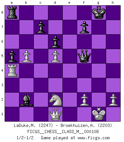 Last move : 1/2-1/2 2022 October 2 21:17:6 [Event "FICGS__CHESS__CLASS_M__000108"] [Site "FICGS"] [Date "2022.08.23"] [Round "1"] [White "LaDuke,Matt"] [Black "Broekhuizen,A. T. S."] [Result "1/2-1/2"] [WhiteElo "2247"] [BlackElo "2203"] 1.e4 e5 2.Nf3 Nc6 3.Bb5 a6 4.Ba4 Nf6 5.O-O Bc5 6.c3 b5 7.Bb3 d6 8.d4 Bb6 9.a4 Bb7 10.Re1 O-O 11.Bg5 h6 12.Bh4 exd4 13.cxd4 g5 14.Nxg5 hxg5 15.Bxg5 Nxd4 16.Bd5 Bxd5 17.exd5 Nf5 18.Ra3 Bd4 19.g4 Re8 20.Rxe8+ Qxe8 21.gxf5 Qe5 22.Bxf6 Qxf6 23.axb5 a5 24.Ra4 Bxb2 25.Nd2 Qxf5 1/2-1/2 Follow this game move after move (download)Blessed be the memory of him who gave the world this immortal game. (A. G. Gardiner) Wenn man heute mit 14 Jahren noch kein GM ist, kann man es vergessen. (Viswanathan Anand) Cuando no sepas que mover, espera por una idea que se le venga a la la cabeza de tu oponente. Tenlo por seguro de que esa idea estará incorrecta. (Siegbert Tarrasch) Nous vivons dans un monde échiquéen : chaque jour qui passe est un défi à relever. (Philosophe Sasha) All art requires courage. (Anne Tucker)