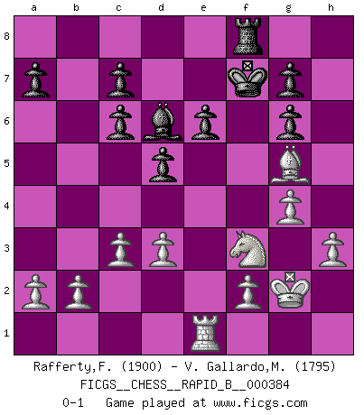 Last move : 0-1 2022 November 17 12:43:23 [Event "FICGS__CHESS__RAPID_B__000384"] [Site "FICGS"] [Date "2022.08.24"] [Round "1"] [White "Rafferty,Frey"] [Black "V. Gallardo,Miguel"] [Result "0-1"] [WhiteElo "1900"] [BlackElo "1795"] 1.e4 e5 2.Nf3 Nc6 3.Bb5 Nf6 4.d3 d6 5.O-O Be7 6.c3 Bg4 7.Nbd2 O-O 8.Re1 d5 9.h3 Bh5 10.g4 Bg6 11.Bxc6 bxc6 12.Nxe5 Qd6 13.Nxg6 hxg6 14.e5 Qe6 15.exf6 Qxf6 16.Nf3 Rae8 17.Kg2 Bd6 18.Bg5 Rxe1 19.Qxe1 Qe6 20.Qxe6 fxe6 21.Re1 Kf7 0-1 Follow this game move after move (download)Half the variations which are calculated in a tournament game turn out to be completely superfluous. Unfortunately, no one knows in advance which half. (Jan Tinman) Drei Punkte vor allen anderen ist wie einer, der im weißen Anzug posiert, während der Rest in Müllsäcke gekleidet dasteht. (Viktor Kortschnoi) No es suficiente ser un buen jugador, se debe también de jugar bién. (Siegbert Tarrasch) À la honte des hommes, on sait que les lois du jeu sont les seules qui soient partout justes, claires, inviolables et exécutées. Pourquoi l'Indien qui a donné les règles du jeu d'échecs est-il obéi de bon gré dans toute la terre, et que les décrétales des papes, par exemple, sont aujourd'hui un objet d'horreur et de mépris ? C'est que l'inventeur des échecs combina tout avec justesse pour la satisfaction des joueurs, et que les papes, dans leurs décrétales, n'eurent en vue que leur seul avantage. L'Indien voulut exercer également l'esprit des hommes et leur donner du plaisir; les papes ont voulu abrutir l'esprit des hommes. Voltaire (Dictionnaire philosophique / Garnier 1967) There is far too much law for those who can afford it and far too little for those who cannot. (Derek Bok)