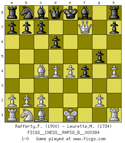 Last move : 1-0 2022 August 27 21:19:44 [Event "FICGS__CHESS__RAPID_B__000384"] [Site "FICGS"] [Date "2022.08.24"] [Round "1"] [White "Rafferty,Frey"] [Black "Leurette,Marc-Antoine"] [Result "1-0"] [WhiteElo "1900"] [BlackElo "1734"] 1.e4 e5 2.f4 exf4 3.Nf3 g5 4.Bc4 Nh6 5.d4 d6 6.h4 f6 7.Nxg5 fxg5 8.Qh5+ Nf7 9.Qxf7 1-0 Follow this game move after move (download)The boy (then a 12 year old boy named Anatoly Karpov) doesn't have a clue about Chess, and there's no future at all for him in this profession. (Mikhail Botvinnik) Bis jetzt ist Weiß einer wohlbekannten Analyse gefolgt. Aber jetzt begeht er einen schrecklichen Fehler: Er beginnt seinen eigenen Kopf zu benutzen. (Siegbert Tarrasch) El Ajedrez es el arte del análisis. (Mikhail Botvinnik) On n'a jamais que l'âge auquel on a commence à jouer aux échecs car après on cesse de vieillir. (Capablanca) Information on the Internet is subject to the same rules and regulations as conversation at a bar. (George Lundberg)