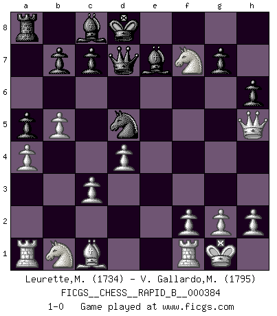 Last move : 1-0 2022 September 11 17:51:6 [Event "FICGS__CHESS__RAPID_B__000384"] [Site "FICGS"] [Date "2022.08.24"] [Round "1"] [White "Leurette,Marc-Antoine"] [Black "V. Gallardo,Miguel"] [Result "1-0"] [WhiteElo "1734"] [BlackElo "1795"] 1.e4 e5 2.Nf3 Nc6 3.Bc4 Bc5 4.c3 h6 5.b4 Bb6 6.d3 Nf6 7.a4 a5 8.b5 Ne7 9.Nxe5 d6 10.Nxf7 Qd7 11.Nxh8 d5 12.exd5 Nfxd5 13.Bxd5 Nxd5 14.O-O Bc5 15.d4 Be7 16.Qh5+ Kd8 17.Nf7+ 1-0 Follow this game move after move (download)Chess is the art which expresses the science of logic. (Mikhail Botvinnik) Ich spiele ehrlich und spiele, um zu gewinnen. Wenn ich verliere nehme ich meine Medizin. (Robert James Fischer) Por esta medida (el intervalo entre Fischer y sus contemporaneos), yo le considero el mas grande campeón mundial. (Garry Kasparov) L'action d'une oeuvre littéraire se déroule sur un champ de bataille. Les masques et les types du drame moderne correspondent aux pièces du jeu d'échecs. L'intrigue correspond aux coups et aux gambits, c'est à dire aux techniques du jeu telles qu'utilisées et interprétées par les joueurs. Les tactiques et les péripéties [mouvements] correspondent aux coups exécutés par l'adversaire. (Viktor Shklovsky) Macintosh - we might not get everything right, but at least we knew the century was going to end. (Douglas Adams)