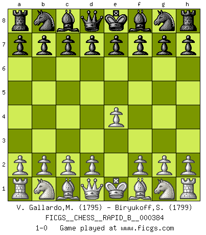Last move : 1-0 2022 September 24 0:24:21 [Event "FICGS__CHESS__RAPID_B__000384"] [Site "FICGS"] [Date "2022.08.24"] [Round "1"] [White "V. Gallardo,Miguel"] [Black "Biryukoff,Sergey"] [Result "1-0"] [WhiteElo "1795"] [BlackElo "1799"] 1.e4 1-0 This chess game has been lost on time (started : 2022.08.24 11:32:54) Follow this game move after move (download)The older I grow, the more I value Pawns. (Keres) Die Jungen erwarten, dass Opa einfach umfällt. Dann aber kann Opa fünf Stunden lang Schach spielen und die jungen Gegner an die Wand drücken. (Viktor Kortschnoi) Estaba muy claro de que el punto vulnerable del Gran Maestro Americano (Bobby Fischer) radicaba en las posiciones de doble filo, colgantes, irracionales, donde el siempre falló en encontrar un triunfo aún en una posición de clara victoria. (Efim Geller) Vous n'êtes pas toujours obligé de jouer le meilleur coup. Un coup doit être actif, entreprenant, correct et beau ! (David Bronstein) Happy endings are just stories that haven't finished yet. (Jane Smith in Mr & Mrs Smith)