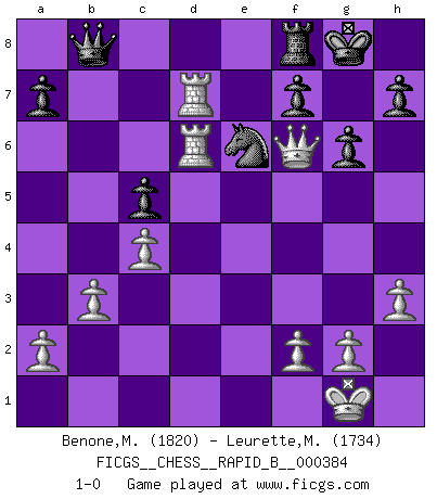 Last move : 1-0 2022 November 7 21:17:25 [Event "FICGS__CHESS__RAPID_B__000384"] [Site "FICGS"] [Date "2022.08.24"] [Round "1"] [White "Benone,Mateia"] [Black "Leurette,Marc-Antoine"] [Result "1-0"] [WhiteElo "1820"] [BlackElo "1734"] 1.e4 e5 2.Nf3 Nc6 3.d4 exd4 4.Nxd4 Nf6 5.Nxc6 bxc6 6.e5 Nd5 7.c4 Nb6 8.Bd3 Bb4+ 9.Nd2 Bxd2+ 10.Bxd2 O-O 11.O-O c5 12.Qh5 g6 13.Qf3 d6 14.exd6 Rb8 15.dxc7 Qxc7 16.Bf4 Qb7 17.Bxb8 Qxb8 18.b3 Bb7 19.Be4 Bxe4 20.Qxe4 Re8 21.Qf3 Nd7 22.Rfd1 Nf8 23.Rd5 Ne6 24.h3 Nd4 25.Qf6 Qb6 26.Rd6 Qb8 27.Rd1 Ne6 28.Rd7 Rf8 29.R1d6 1-0 Follow this game move after move (download)White lost because he failed to remember the right continuation and had to think up the moves himself. (Siegbert Tarrasch) Wer der Ansicht ist, daß alle Schachspieler verrückt sind, wird durch Studium des Lebens von Emil Josef Diemer nicht auf andere Gedanken kommen. (Hans Ree) Buenas posiciones no logran ganar juegos, buenas movidas sí. (Gerald Abrahams) Echiquier : carré parfait, comme la Jérusalem nouvelle décrite par l'auteur de l'Apocalypse, huit cases sur huit, exaltation du chiffre 4, symbole du cosmos aux quatre horizons... où le noir et le blanc, l'ombre et la lumière, le mal et le bien s'entremêlent et se conjuguent. (Robert Couffignal, Le Gambit du poète) Inventor: A person who makes an ingenious arrangement of wheels, levers and springs, and believes it civilization. (Ambrose Bierce, The Devil's Dictionary)