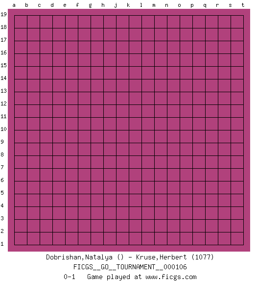 Last move : 0-1 2022 September 24 19:49:1 [Event "FICGS__GO__TOURNAMENT__000106"] [Site "FICGS"] [Date "2022.08.25"] [Round "1"] [Black "Dobrishan,Natalya"] [White "Kruse,Herbert"] [Result "0-1"] [Rating 2 "1077"] 0-1 This go game has been lost on time (started : 2022.08.25 17:22:13) Follow this game move after move (download)Very few good moves are played. (Pierre Audouard) If passion drives you, let reason holds the reins. (Benjamin Franklin)