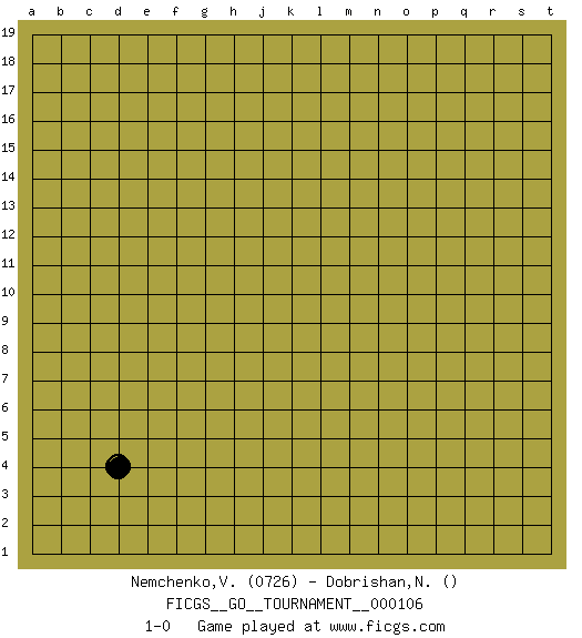 Last move : 1-0 2022 September 24 19:49:1 [Event "FICGS__GO__TOURNAMENT__000106"] [Site "FICGS"] [Date "2022.08.25"] [Round "1"] [Black "Nemchenko,Valery"] [White "Dobrishan,Natalya"] [Result "1-0"] [Rating 1 "0726"] 1.d4 1-0 This go game has been lost on time (started : 2022.08.25 17:22:13) Follow this game move after move (download)On the second line six die, eight live. (Anonymous) A generalist learns less and less about more and more until he knows nothing about everything. (Author unknown)
