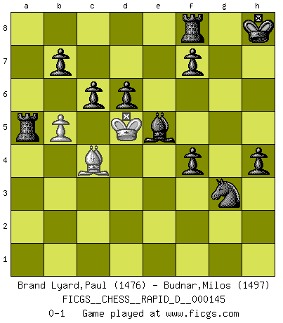 Last move : 0-1 2022 September 6 20:53:2 [Event "FICGS__CHESS__RAPID_D__000145"] [Site "FICGS"] [Date "2022.08.25"] [Round "1"] [White "Brand Lyard,Paul"] [Black "Budnar,Milos"] [Result "0-1"] [WhiteElo "1476"] [BlackElo "1497"] 1.e4 e5 2.Bc4 Nf6 3.Nc3 Bb4 4.d3 O-O 5.a3 Ba5 6.b4 Bb6 7.Bg5 h6 8.Bxh6 gxh6 9.Nd5 Nxd5 10.exd5 Qg5 11.Nf3 Qf6 12.O-O d6 13.Re1 Bg4 14.Qd2 Bxf3 15.d4 Bxg2 16.Re2 Qg7 17.f4 Bf3+ 18.Kf2 Qg2+ 19.Ke3 Bxd4+ 20.Kd3 Qxe2+ 21.Qxe2 Bxe2+ 22.Kd2 Bxa1 23.Kxe2 exf4 24.h4 Nd7 25.Kf3 Be5 26.Bb5 Nb6 27.h5 Nxd5 28.Bc4 Nf6 29.a4 Nxh5 30.Ke4 Ng3+ 31.Kd5 h5 32.b5 h4 33.Bd3 Kh8 34.a5 a6 35.c4 axb5 36.cxb5 Rxa5 37.Bc4 c6 0-1 Follow this game move after move (download)Daring ideas are like Chess men moved forward. They may be beaten, but they may start a winning game. (Johann Wolfgang von Goethe) Die Auseinandersetzung mit Karpow war politisch geprägt. Er stand für das kommunistische System, wurde von dessen Repräsentanten gehätschelt. Ich war der Oppositionelle. Jeder Schachweltmeister spiegelt auch die gesellschaftlichen Verhältnisse wider. Kramnik steht für die Börsen-Generation des Neuen Markts, ideologiefrei, zahlenfixiert. (Garry Kasparov) Yo he agregado estos principios a la ley: pongan los Caballos en acción antes de que los dos Alfiles sean desarrollados. (Emanuel Lasker) Ce n'est pas pour s'amuser qu'il joue aux échecs : il célèbre un culte. (Vladimir Nabokov) You cannot beat a roulette table unless you steal money from it. (Albert Einstein)