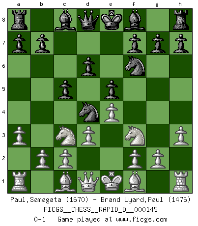 Last move : 0-1 2022 October 1 12:7:56 [Event "FICGS__CHESS__RAPID_D__000145"] [Site "FICGS"] [Date "2022.08.25"] [Round "1"] [White "Paul,Samagata"] [Black "Brand Lyard,Paul"] [Result "0-1"] [WhiteElo "1670"] [BlackElo "1476"] 1.e4 e5 2.Nf3 Nc6 3.a3 d6 4.h3 Nf6 5.Nc3 Nd4 6.d3 c5 0-1 This chess game has been lost on time (started : 2022.08.25 18:57:36) Follow this game move after move (download)The essence of Chess is thinking about what Chess is. (David Bronstein) Obendrein hat der FIDE-Präsident den Revolutionsführer Gaddafi zum »Großmeister« ernannt, am Ende der WM. Das ist lächerlich! (Joel Lautier) Entre mas años cumplo, mas valoro los Peones. (Keres) L'action d'une oeuvre littéraire se déroule sur un champ de bataille. Les masques et les types du drame moderne correspondent aux pièces du jeu d'échecs. L'intrigue correspond aux coups et aux gambits, c'est à dire aux techniques du jeu telles qu'utilisées et interprétées par les joueurs. Les tactiques et les péripéties [mouvements] correspondent aux coups exécutés par l'adversaire. (Viktor Shklovsky) Somewhere in the world there is an epigram for every dilemma. (Hendrik Willem van Loon)