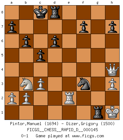 Last move : 0-1 2022 October 6 10:37:40 [Event "FICGS__CHESS__RAPID_D__000145"] [Site "FICGS"] [Date "2022.08.25"] [Round "1"] [White "Pintor,Manuel"] [Black "Dizer,Grigory"] [Result "0-1"] [WhiteElo "1694"] [BlackElo "1500"] 1.e4 e5 2.f4 Nc6 3.Bc4 exf4 4.Nf3 g5 5.d4 g4 6.O-O gxf3 7.Qxf3 Qe7 8.c3 Ne5 9.dxe5 Qc5+ 10.Kh1 Qxc4 11.Bxf4 b6 12.Nd2 Qe6 13.Nb3 c5 14.Bg5 Be7 15.Bxe7 Nxe7 16.Rf2 Ng6 17.Raf1 Ba6 18.Rd1 Nxe5 19.Qg3 O-O-O 20.Rd5 d6 21.h3 Bb7 22.R5d2 Bxe4 23.Rde2 Rhg8 24.Qh4 Bb7 25.Kh2 Bxg2 26.Rxg2 Nf3+ 27.Kh1 Qxe2 28.Rxe2 Rg1+ 0-1 Follow this game move after move (download)Mistrust is the most necessary characteristic of the Chess player. (Siegbert Tarrasch) Kasparov stellt für gewöhnlich die Regeln auf und bricht sie dann selbst wieder. (Alexej Shirov) Después de la respuesta de las negras a 1.e4 con 1..e5, se quedan siempre tratando de entrar dentro del juego. (Howard Staunton) Le jeu d'échecs est comme rejeté hors du temps. (Antoine de Saint-Exupéry) When you've done things right people won't know you've done anything at all. (Futurama)
