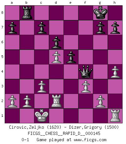 Last move : 0-1 2022 October 25 7:8:23 [Event "FICGS__CHESS__RAPID_D__000145"] [Site "FICGS"] [Date "2022.08.25"] [Round "1"] [White "Cirovic,Zeljko"] [Black "Dizer,Grigory"] [Result "0-1"] [WhiteElo "1620"] [BlackElo "1500"] 1.e4 e5 2.Nf3 Nc6 3.Nc3 Be7 4.d4 exd4 5.Nxd4 d6 6.Nxc6 bxc6 7.Bc4 Nf6 8.Bf4 O-O 9.Qd2 Be6 10.Bxe6 fxe6 11.O-O-O Rb8 12.f3 Nd5 13.Nxd5 cxd5 14.exd5 Rxf4 15.Qxf4 Bg5 16.Qd2 Bxd2+ 17.Rxd2 Qf6 18.c3 e5 19.h4 Qf4 0-1 Follow this game move after move (download)Chess demands total concentration. (Bobby Fischer) Ich kenne Menschen, die allen Willen der Welt besitzen und doch nicht Schach spielen können. (Robert James Fischer) Una partida de Ajedrez se divide en 3 etapas: la primera cuando piensas que tienes la ventaja, la segunda cuando crees que tienes la ventaja y la tercera... ¡cuando te das cuenta que vas a perder!. (Savielly Tartakower) La guerre est enfant de la passion, la passion est enfant du narcissisme et le narcissisme est l'enfant. (...) Une autre partie ? (Thibault de Vassal) They say poker is a zero-sum game. It must be, because every time I play my sum ends up zero. (Max Shapiro)