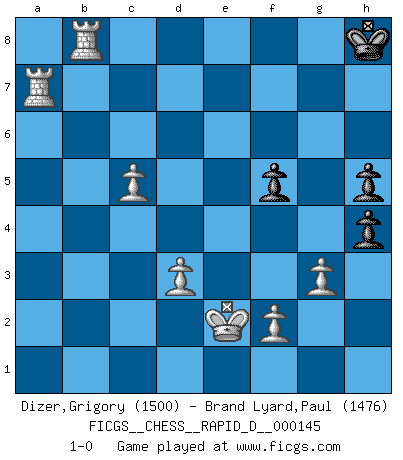 Last move : 1-0 2022 October 3 20:13:13 [Event "FICGS__CHESS__RAPID_D__000145"] [Site "FICGS"] [Date "2022.08.25"] [Round "1"] [White "Dizer,Grigory"] [Black "Brand Lyard,Paul"] [Result "1-0"] [WhiteElo "1500"] [BlackElo "1476"] 1.a3 Nf6 2.c4 c5 3.Nc3 d6 4.Nf3 Bg4 5.g3 Bxf3 6.exf3 g6 7.b4 e5 8.Rb1 b6 9.Bg2 cxb4 10.axb4 Nbd7 11.f4 Rc8 12.d3 exf4 13.Bxf4 h5 14.Nb5 Qe7+ 15.Qe2 Qxe2+ 16.Kxe2 a6 17.Nxd6+ Bxd6 18.Bxd6 a5 19.Bb7 Rd8 20.bxa5 Rb8 21.a6 Rxb7 22.axb7 Nb8 23.Bxb8 Ke7 24.Be5 Rd8 25.Bxf6+ Kxf6 26.Rxb6+ Kg5 27.b8Q Rxb8 28.Rxb8 f5 29.h4+ Kh6 30.c5 g5 31.Rb6+ Kg7 32.Ra1 gxh4 33.Ra7+ Kh8 34.Rb8+ 1-0 Follow this game move after move (download)Chess is a forcing house where the fruits of character can ripen more fully than in life. (Edward Morgan Foster) Wenn Du absolut nicht mehr weißt, was Du tun sollst, dann ist es Zeit für Panik. (John van der Wiel) ¿Porque tengo que perder ante este idiota?. (Aron Nimzovich) La vie et les Echecs sont tous les deux une lutte constante. (Lasker) The Internet is so big, so powerful and pointless that for some people it is a complete substitute for life. (Andrew Brown)