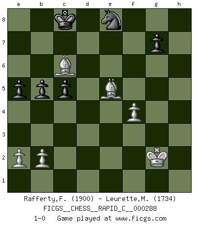 Last move : 1-0 2022 September 4 22:22:12 [Event "FICGS__CHESS__RAPID_C__000288"] [Site "FICGS"] [Date "2022.08.26"] [Round "1"] [White "Rafferty,Frey"] [Black "Leurette,Marc-Antoine"] [Result "1-0"] [WhiteElo "1900"] [BlackElo "1734"] 1.g4 e5 2.Bg2 h5 3.gxh5 d5 4.d4 exd4 5.c3 dxc3 6.Nxc3 Be6 7.Nxd5 Nc6 8.e4 Bd6 9.Nf3 Nf6 10.Bg5 Rxh5 11.h4 Be7 12.Nf4 Qxd1+ 13.Rxd1 Rh8 14.Nxe6 fxe6 15.e5 Nd5 16.Bc1 O-O-O 17.Bh3 Bxh4 18.Bxe6 Kb8 19.Rxh4 Nxe5 20.Rxh8 Nxf3+ 21.Ke2 Rxh8 22.Kxf3 Nf6 23.Kg2 b6 24.Rh1 Rxh1 25.Kxh1 c5 26.Bf4 Kb7 27.Be5 Ne8 28.Bd5 Kc8 29.f4 a5 30.Kg2 b5 31.Bc6 1-0 Follow this game move after move (download)All my games are real. (Bobby Fischer) Wenn ich Weiß habe gewinne ich weil ich Weiß habe, wenn ich Schwarz habe gewinne ich weil ich Bogoljubov bin. (Efim Bogoljubov) Creo que una cierta cantidad de temperamento es esperada de los genios del Ajedrez. (Ron Gross) On entre au jeu d'Echecs comme on entre en Religion. Pour le joueur d'Echecs, la partie d'Echecs c'est l'office, la messe, le défilé du 1er Mai, le dépôt de gerbe au Monument aux Morts. C'est un drame sacré. (Michel Roos) To err is human, to shift the blame on someone else is tactical. (Mladen Jankovic)