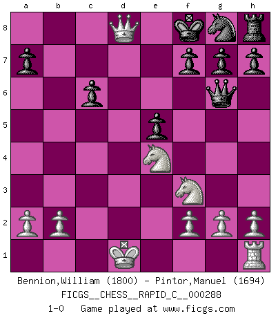 Last move : 1-0 2022 September 6 21:20:8 [Event "FICGS__CHESS__RAPID_C__000288"] [Site "FICGS"] [Date "2022.08.26"] [Round "1"] [White "Bennion,William"] [Black "Pintor,Manuel"] [Result "1-0"] [WhiteElo "1800"] [BlackElo "1694"] 1.e4 e5 2.Nf3 Nc6 3.Bc4 Bc5 4.c3 Qf6 5.d4 exd4 6.e5 Nxe5 7.Qe2 d6 8.cxd4 Bb4+ 9.Bd2 Bxd2+ 10.Nbxd2 Be6 11.dxe5 dxe5 12.Ne4 Qg6 13.Bxe6 Qxe6 14.Qb5+ c6 15.Qxb7 Rd8 16.Rd1 Rxd1+ 17.Kxd1 Qg6 18.Qc8+ Ke7 19.Qc7+ Kf8 20.Qd8+ 1-0 Follow this game move after move (download)Methodical thinking is of more use in Chess than inspiration. (C. J. S. Purdy) Schach ist Krieg, im Schach geht es um testosterongesteuerte Urschreie. (Garry Kasparov) En el Ajedrez, cuando menos, el valiente hereda la tierra. (Edmar Mednis) Un journaliste : 'Vous préférez avoir une dame de plus sur l'échiquier ou au lit ?' Boris Spassky : 'Ca dépend de la position.' The age of a woman doesn't mean a thing. The best tunes are played on the oldest fiddles. (Ralph Waldo Emerson)
