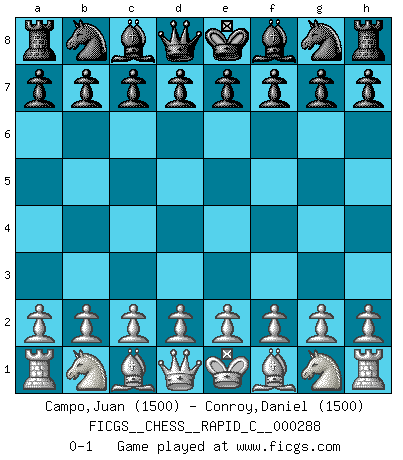 Last move : 0-1 2022 September 25 8:4:13 [Event "FICGS__CHESS__RAPID_C__000288"] [Site "FICGS"] [Date "2022.08.26"] [Round "1"] [White "Campo,Juan"] [Black "Conroy,Daniel"] [Result "0-1"] [WhiteElo "1500"] [BlackElo "1500"] 0-1 This chess game has been lost on time (started : 2022.08.26 0:44:35) Follow this game move after move (download)In Chess, just as in life, today's bliss may be tomorrow's poison. (Assaic) Der Bart als Geschlechtszeichen mitten im Gesicht ist obszön. Daher gefällt er den Weibern. [Zugegeben, kein Schachzitat, aber unglaublich originell] (Arthur Schopenhauer) Me dio la sensación de como si yo estuviera jugando en contra del mismo Ajedrez. - al estar jugando en contra de Robert Fischer (Walter Shipman) Lorsque vous vous retrouvez devant une position atroce, ne tendez pas un ultime piège dérisoire avec l'intention d'abandonner si l'adversaire le déjoue ! Faites-vous plutôt un devoir de résister comme si votre vie en dépendait. Jouez le coup qui vous déplairait au centuple si vous étiez dans la peau de votre tortionnaire ! Luck never made a man wise. (Seneca, Letters to Lucilius)