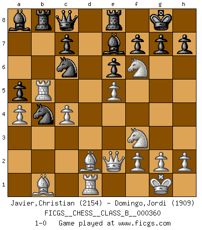 Last move : 1-0 2023 January 26 23:14:44 [Event "FICGS__CHESS__CLASS_B__000360"] [Site "FICGS"] [Date "2022.08.28"] [Round "1"] [White "Javier,Christian"] [Black "Domingo,Jordi"] [Result "1-0"] [WhiteElo "2154"] [BlackElo "1909"] 1.d4 b5 2.Nd2 Bb7 3.e4 a6 4.a4 Nf6 5.e5 Nd5 6.Ngf3 b4 7.Ne4 e6 8.Bd3 Be7 9.O-O Nc6 10.c4 bxc3 11.bxc3 Rb8 12.Bd2 d6 13.Qe2 a5 14.Rfb1 Ba8 15.Rb5 dxe5 16.dxe5 O-O 17.Rd1 Re8 18.c4 Ndb4 19.Bb1 Qc8 20.Nf6+ 1-0 Follow this game move after move (download)By the beauty of his games, the clarity of his play, and the brilliance of his ideas, Fischer made himself an artist of the same stature as Brahms, Rembrandt, and Shakespeare. (David Levy) Ohne Leiden bildet sich kein Charakter. (Ernst Freiherr von Feuchtersleben) El Ajedrez hace al hombre ser mas sabio y ver mas claro. (Vladimir Putin) Je crois qu'il existe des manières très spécifiques de jouer efficacement contre une machine. Evidemment, nous n'avons aucune chance en technique pure, parce que l'ordinateur calcule de manière parfaite. Mais lorsque nous faisons appel à notre cerveau, en utilisant l'intuition et la compréhension, alors nous restons beaucoup plus forts. (Anatoli Karpov) Success without honor is an unseasoned dish; it will satisfy your hunger, but it won't taste good. (Joe Paterno)