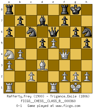 Last move : 0-1 2022 November 18 2:8:54 [Event "FICGS__CHESS__CLASS_B__000360"] [Site "FICGS"] [Date "2022.08.28"] [Round "1"] [White "Rafferty,Frey"] [Black "Trigance,Emile"] [Result "0-1"] [WhiteElo "1900"] [BlackElo "1806"] 1.d4 a6 2.e4 e6 3.Bd3 d5 4.Nc3 Bb4 5.e5 c5 6.Qg4 g6 7.dxc5 Bxc5 8.Nf3 Bd7 9.O-O Nc6 10.Re1 h5 11.Qg3 Nh6 12.Bg5 Be7 13.Qf4 Bxg5 14.Nxg5 Qe7 15.a3 Na5 16.b4 Nc6 17.Na4 O-O 18.Nxe6 Qxe6 0-1 Follow this game move after move (download)Fischer is under obligation to nobody. (Joseph Platz) Ich suche im Schach immer etwas Eigenes. Riskantes Spiel im Stile schachlicher Musketiere ist nicht meine Sache, auch wenn es vielen Freunden scharfer Wendungen gefällt. (Anatoly Karpov) Antes de los Finales, los dioses han colocado el Juego Medio. (Siegbert Tarrasch) Fischer est le meilleur joueur du monde et Karpov n'est qu'un joueur de bistrot. (Garry Kasparov, agé de 16 ans) There will be no order, only chaos. (Sol Robeson in Pi by Darren Aronofsky)