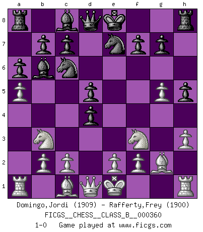 Last move : 1-0 2022 November 18 2:8:54 [Event "FICGS__CHESS__CLASS_B__000360"] [Site "FICGS"] [Date "2022.08.28"] [Round "1"] [White "Domingo,Jordi"] [Black "Rafferty,Frey"] [Result "1-0"] [WhiteElo "1909"] [BlackElo "1900"] 1.g4 d5 2.h3 h5 3.g5 e5 4.Bg2 Nc6 5.d4 exd4 6.Nf3 Bc5 7.Nbd2 Nge7 8.Nb3 Bb6 9.a4 a6 10.a5 1-0 Follow this game move after move (download)A bad day of Chess is better than any good day at work. (Anonymous) Das Schachspiel hat wie die Liebe, die Musik, die Fähigkeit, den Menschen glücklich zu machen. Ich habe ein leises Gefühl des Bedauerns für jeden, der das Schachspiel nicht kennt, so wie ich jeden bedaure, der die Liebe nicht kennt. (Siegbert Tarrasch) El Ajedrez es una manera fabulosa para que los niños aprendan a autovalorarse y a autoestimarse. (Saudin Robovic) Tous ces prétendus hommes politiques sont les pions, les Cavaliers, les Tours ou les Fous d'une partie d'échecs qui se jouera tant qu'un hasard ne renversera pas l'échiquier. (Honoré de Balzac) I'll be back. (Arnold Schwarzenegger)