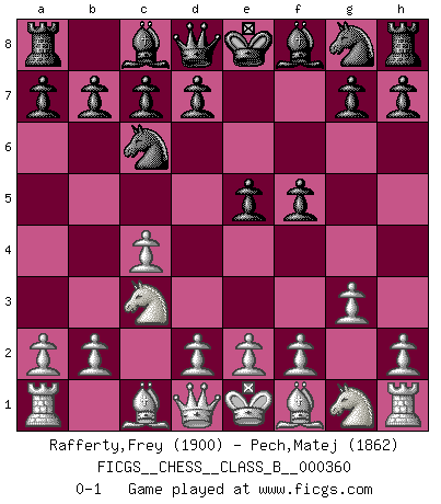 Last move : 0-1 2022 December 4 1:49:12 [Event "FICGS__CHESS__CLASS_B__000360"] [Site "FICGS"] [Date "2022.08.28"] [Round "1"] [White "Rafferty,Frey"] [Black "Pech,Matej"] [Result "0-1"] [WhiteElo "1900"] [BlackElo "1862"] 1.c4 e5 2.Nc3 Nc6 3.g3 f5 0-1 Follow this game move after move (download)The enormous mental resilience, without which no Chess player can exist, was so much taken up by Chess that he could never free his mind of this game. (Albert Einstein) Mein erstes Ziel war nicht, die Partie zu gewinnen, sondern eine Figur zu opfern. -- der junge (Wilhelm Steinitz) El juego del Ajedrez no es solamente una diversión quieta; algunas cualidades muy valuables de la mente se pueden adquirir y cultivar con el, como convertirlos en habitos disponibles para toda ocasión; ya que la vida es algo así como el Ajedrez. (Benjamin Franklin) On peut tirer plus d'utilité d'une partie perdue que de 100 parties gagnées. (Capablanca) The real danger is not that computers will begin to think like men, but that men will begin to think like computers. (Sydney J. Harris)