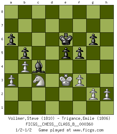 Last move : 1/2-1/2 2022 October 18 15:23:56 [Event "FICGS__CHESS__CLASS_B__000360"] [Site "FICGS"] [Date "2022.08.28"] [Round "1"] [White "Vollmer,Steve"] [Black "Trigance,Emile"] [Result "1/2-1/2"] [WhiteElo "1810"] [BlackElo "1806"] 1.e4 a6 2.d4 e6 3.c4 d5 4.e5 c5 5.Nf3 cxd4 6.Qxd4 Nc6 7.Qd1 Bc5 8.Be2 dxc4 9.Qxd8+ Nxd8 10.Bxc4 b5 11.Be2 Ne7 12.Nc3 Bb7 13.Bf4 Ng6 14.Bg3 O-O 15.Rd1 Bc6 16.a3 Nb7 17.O-O Rfd8 18.Rfe1 Rxd1 19.Rxd1 Rd8 20.Rxd8+ Nxd8 21.b4 Bb6 22.Kf1 Ne7 23.Nd2 f5 24.exf6 gxf6 25.Bh4 Kg7 26.Bf3 Ng6 27.Bg3 f5 28.Bd6 Kf7 29.Ne2 e5 30.Bh5 Ke6 31.Bxg6 hxg6 32.Bf8 Nf7 33.Nb3 Nd6 34.Nd2 Bd5 35.f3 Be3 36.Bxd6 Kxd6 37.Ke1 Bxd2+ 38.Kxd2 Bc4 39.Nc3 Ke6 40.Ke3 1/2-1/2 Follow this game move after move (download)Chess is a terrible game. If you have no center, your opponent has a freer position. If you do have a center, then you really have something to worry about ! (Siegbert Tarrasch) Wie ich sie so einen nach dem anderen nieder mähte wurde meine Überlegenheit offensichtlich. (José Raúl Capablanca) El Ajedrez es una hermosa aventura. (Bent Larsen) Des points faibles ou des trous dans la position de l'adversaire doivent être occupés par des pièces et non pas par des pions. (Siegbert Tarrasch) Vladimir Ras-Putin is still alive... He is also a good actor, I saw him in the Lord of the Rings. (Rodolfo d'Ettorre)