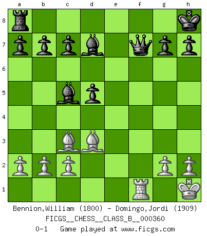 Last move : 0-1 2023 April 7 16:7:50 [Event "FICGS__CHESS__CLASS_B__000360"] [Site "FICGS"] [Date "2022.08.28"] [Round "1"] [White "Bennion,William"] [Black "Domingo,Jordi"] [Result "0-1"] [WhiteElo "1800"] [BlackElo "1909"] 1.e4 e5 2.Nf3 f5 3.Nxe5 Qf6 4.d4 d6 5.Nc4 fxe4 6.Nc3 Qg6 7.f3 exf3 8.Qxf3 Be7 9.Nd5 Bd8 10.Bd3 Qg4 11.Qf2 Nf6 12.O-O O-O 13.Bd2 Nc6 14.Nce3 Qh5 15.Nf4 Qe8 16.Rae1 Be7 17.Qg3 Nh5 18.Nxh5 Qxh5 19.Bc4+ Kh8 20.Rxf8+ Bxf8 21.Rf1 Bd7 22.Nd5 Nxd4 23.Qf2 Nf5 24.Bd3 Ne7 25.Nxe7 Bxe7 26.Bc3 d5 27.Qf7 Bc5+ 28.Kh1 Qxf7 0-1 This chess game has been lost on time (started : 2022.08.28 2:46:17) Follow this game move after move (download)A thorough understanding of the typical mating continuations makes the most complicated sacrificial combinations leading up to them not only not difficult, but almost a matter of course. (Siegbert Tarrasch) Ich hatte Zahnschmerzen im ersten Spiel. In der zweiten Partie tat mir der Kopf weh. In der dritten war es eine Rheuma-Attacke und während der vierten fühlte ich mich nicht gut. Und in der fünften? Nun, man muss doch nicht jedes Spiel gewinnen, oder? (Savielly Grigorievitsch Tartakower) No hay precio que sea tan grande por la cabellera del Rey enemigo. (Koblentz) Le génie consiste à savoir transgresser les règles au moment opportun. (Teichmann) History is a gallery of pictures in which there are few originals and many copies. (Alexis de Tocqueville)