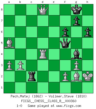 Last move : 1-0 2023 May 2 10:56:12 [Event "FICGS__CHESS__CLASS_B__000360"] [Site "FICGS"] [Date "2022.08.28"] [Round "1"] [White "Pech,Matej"] [Black "Vollmer,Steve"] [Result "1-0"] [WhiteElo "1862"] [BlackElo "1810"] 1.c4 e5 2.Nc3 Nf6 3.Nf3 Nc6 4.g3 Bc5 5.Bg2 d6 6.O-O O-O 7.d3 h6 8.a3 a5 9.e3 Bg4 10.h3 Bd7 11.b3 Qc8 12.Kh2 Ne7 13.d4 exd4 14.Nxd4 c6 15.Bb2 d5 16.cxd5 Nexd5 17.Nxd5 Nxd5 18.Bxd5 Bxh3 19.Bg2 Bg4 20.Qc2 Bxd4 21.exd4 Re8 22.Rfe1 Qd7 23.d5 cxd5 24.Qc3 f6 25.Qd4 Rxe1 26.Rxe1 Rd8 27.Bc3 b6 28.Qxb6 d4 29.Bxa5 Rc8 30.Re4 Rc2 31.Rxd4 Qf5 32.Qd8+ 1-0 Follow this game move after move (download)The battle for the ultimate truth will never be won. And that's why Chess is so fascinating. (Hans Kmoch) Ich verstehe mehr vom Schach als irgendein anderer lebender Meister. (José Raúl Capablanca) Aún deseo matar a Fischer. (Boris Spassky) Même si l'adversaire joue le coup analysé précédemment, recommencez l'analyse en voyant la nouvelle position. Première règle de Blumenfeld It's not the will to win, but the will to prepare to win that makes the difference. (Bear Bryant)