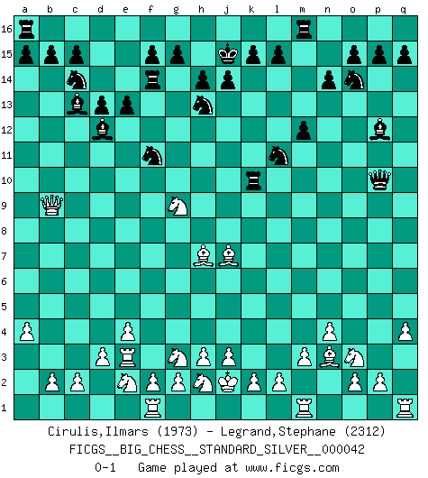 Last move : 0-1 2023 February 17 12:43:18 [Event "FICGS__BIG_CHESS__STANDARD_SILVER__000042"] [Site "FICGS"] [Date "2022.08.29"] [Round "1"] [White "Cirulis,Ilmars"] [Black "Legrand,Stephane"] [Result "0-1"] [WhiteElo "1973"] [BlackElo "2312"] 1.j2-k4 p16-o14 2.h1-l4 j15-k13 3.n2-n4 b16-c14 4.p1-o3 m15-m13 5.l4-f9 h15-g13 6.o1-h7 e15-e13 7.d2-d3 f16-b12 8.c1-j7 l16-p12 9.b1-c3 h16-o10 10.e2-e4 k16-h15 11.m2-m3 d15-d13 12.h2-g4 n15-n14 13.f9-h9 g16-f14 14.l1-p5 o16-f8 15.k4-j6 c16-l8 16.j6-h8 m13-m12 17.f1-e2 m16-m13 18.h8-g6 f8-g7 19.p5-l9 k13-l11 20.h9-f9 l11-j10 21.l9-m10 h15-k14 22.g4-h6 l8-e2 23.g1-e2 j10-l11 24.h6-j8 g7-c11 25.e2-g3 q16-m16 26.e1-e3 m13-k13 27.g6-h8 e16-e14 28.a2-a4 f14-h13 29.q2-q4 e14-f14 30.f9-b9 j16-j15 31.a1-f1 h13-j11 32.m10-l9 k14-h13 33.k1-h2 c11-d12 34.j7-n3 b12-c13 35.l9-j7 o10-p10 36.c3-e2 j11-k9 37.h8-k9 k13-k9 38.j8-g9 k9-k10 39.j1-j2 g13-f11 0-1 Follow this game move after move (download)A player surprised is half beaten. (Proverb) Vom Schach wurde gesagt das Leben sei dafür nicht lange genug. Aber das ist der Fehler des Lebens, nicht des Schach'. (Irving Chernev) Alekhine es un poeta que crea un trabajo de arte de algo que raramente inspiraría a otra persona a mandar una tarjeta postal. (Max Euwe) A chaque perte on perd un peu de soi. (Joël Lautier) If you have any trouble condescending, find a Unix user to show you how it's done. (Scott Adams)