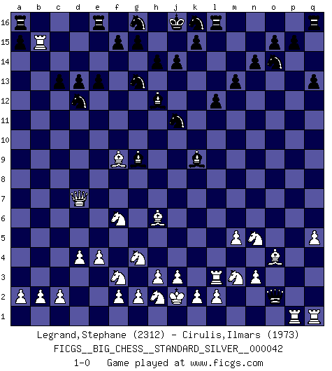 Last move : 1-0 2023 January 22 16:16:21 [Event "FICGS__BIG_CHESS__STANDARD_SILVER__000042"] [Site "FICGS"] [Date "2022.08.29"] [Round "2"] [White "Legrand,Stephane"] [Black "Cirulis,Ilmars"] [Result "1-0"] [WhiteElo "2312"] [BlackElo "1973"] 1.m2-m4 j15-k13 2.p1-o3 h16-l13 3.j2-k4 l13-f8 4.g1-f3 m15-m13 5.b1-c3 d15-d13 6.l1-o4 e15-e13 7.n2-n3 q15-q13 8.d2-d4 c16-k9 9.e2-e4 b16-c14 10.h1-o7 p16-o14 11.f1-b5 l16-p12 12.c1-k8 n15-n14 13.h2-g4 h15-g13 14.o1-f9 p12-l8 15.m4-m5 o16-g9 16.o3-m4 f16-c13 17.m4-l6 k13-j11 18.k1-h2 l8-p4 19.m1-m3 p4-n2 20.k8-h6 f8-b8 21.m3-l3 n2-f9 22.b5-f9 m16-l16 23.a1-b1 c13-f10 24.e1-e3 l15-l13 25.o7-d7 c14-d12 26.c3-d5 l13-l12 27.d5-f6 f10-h12 28.e3-b3 b8-p8 29.b3-b15 p8-p2 30.j1-j2 p2-o2 31.q2-q4 o2-o3 32.q4-q5 c15-c13 33.l6-n5 o3-p2 34.b1-p1 p2-o2 35.k4-m3 1-0 Follow this game move after move (download)A win by an unsound combination, however showy, fills me with artistic horror. (Wilhelm Steinitz) Ich trinke, ich rauche, ich spiele, ich liebe Frauen aber Fernschach ist ein Laster, das ich nicht habe. (Mikhail Nekhemyevich Tal) ¿Quién es tu oponente esta tarde? Esta tarde mi oponente son las piezas negras. (Akiba Rubinstein) Il vaut mieux sacrifier les pièces de l'adversaire. (Xavier Tartacover) Statistics can be made to prove anything - even the truth. (Author unknown)