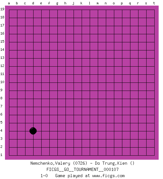 Last move : 1-0 2022 October 4 10:56:21 [Event "FICGS__GO__TOURNAMENT__000107"] [Site "FICGS"] [Date "2022.09.03"] [Round "1"] [Black "Nemchenko,Valery"] [White "Do Trung,Kien"] [Result "1-0"] [Rating 1 "0726"] 1.d4 1-0 This go game has been lost on time (started : 2022.09.03 2:51:39) Follow this game move after move (download)Avoid the plate connection. (Anonymous) Fortune favours the audacious. (Desiderius Erasmus)