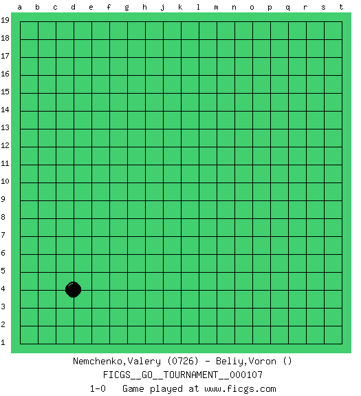 Last move : 1-0 2022 October 4 10:56:21 [Event "FICGS__GO__TOURNAMENT__000107"] [Site "FICGS"] [Date "2022.09.03"] [Round "1"] [Black "Nemchenko,Valery"] [White "Beliy,Voron"] [Result "1-0"] [Rating 1 "0726"] 1.d4 1-0 This go game has been lost on time (started : 2022.09.03 2:51:39) Follow this game move after move (download)Go is essentially a form of harmony. Go in the 21st century will have to be go of the 'harmony of the six points - the four quarters, the above and the below.' As in life we will need to view the whole rather than the part. Japanese go has focused too heavily on the local (joseki) rather than the whole for 300 years. The reason the Chinese and Koreans are overtaking the Japanese is that they are closer to achieve this whole-board view. (Go Seigen, 9p, 1994) I've lost money so fast in these clubs it's left me reeling. I've read every poker book ever written, but the only way to get better at the game is to go out and play with people who are really good. The problem is, you stand to lose a lot of money doing it. (Matt Damon)