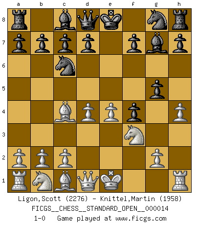 Last move : 1-0 2022 October 13 15:2:24 [Event "FICGS__CHESS__STANDARD_OPEN__000014"] [Site "FICGS"] [Date "2022.09.03"] [Round "2"] [White "Ligon,Scott"] [Black "Knittel,Martin"] [Result "1-0"] [WhiteElo "2276"] [BlackElo "1958"] 1.e4 e5 2.f4 exf4 3.Bc4 Nc6 4.Nf3 g5 5.d4 Bg7 6.h4 1-0 This chess game has been lost on time (started : 2022.09.03 6:24:42) Follow this game move after move (download)Openings teach you openings. Endgames teach you chess ! (Stephan Gerzadowicz) Ich hatte Zahnschmerzen im ersten Spiel. In der zweiten Partie tat mir der Kopf weh. In der dritten war es eine Rheuma-Attacke und während der vierten fühlte ich mich nicht gut. Und in der fünften? Nun, man muss doch nicht jedes Spiel gewinnen, oder? (Savielly Grigorievitsch Tartakower) Me siento como si fuera una pieza en una partida de Ajedrez, cuando mi oponente me indica: esa pieza no puede ser movida. (Soren Kierkegaard) Mon pion favori sur ma case favorite ! Bronstein en parlant d'un coup de pion en h5 quand il avait les Noirs. Perseverance does not equal worthiness. Next time you want to get my attention, wear something fun. Low-riding jeans are hot. (Gregory House, House M.D.)